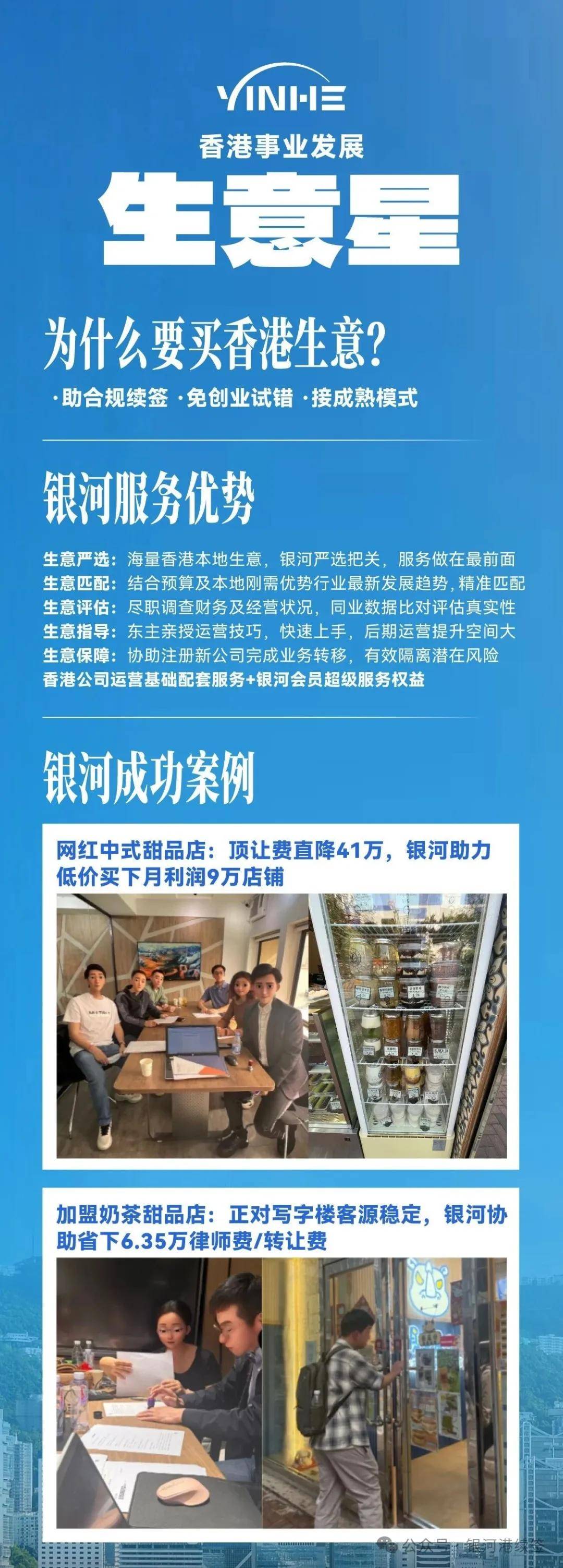通过银河集团专业的服务,你可以选择盘一个香港店铺做生意,或是开一家香港公司创业,获得一份香港事业。全程由银河协助,帮助客户打破信息壁垒,避免因信息壁垒问题产生的风险。