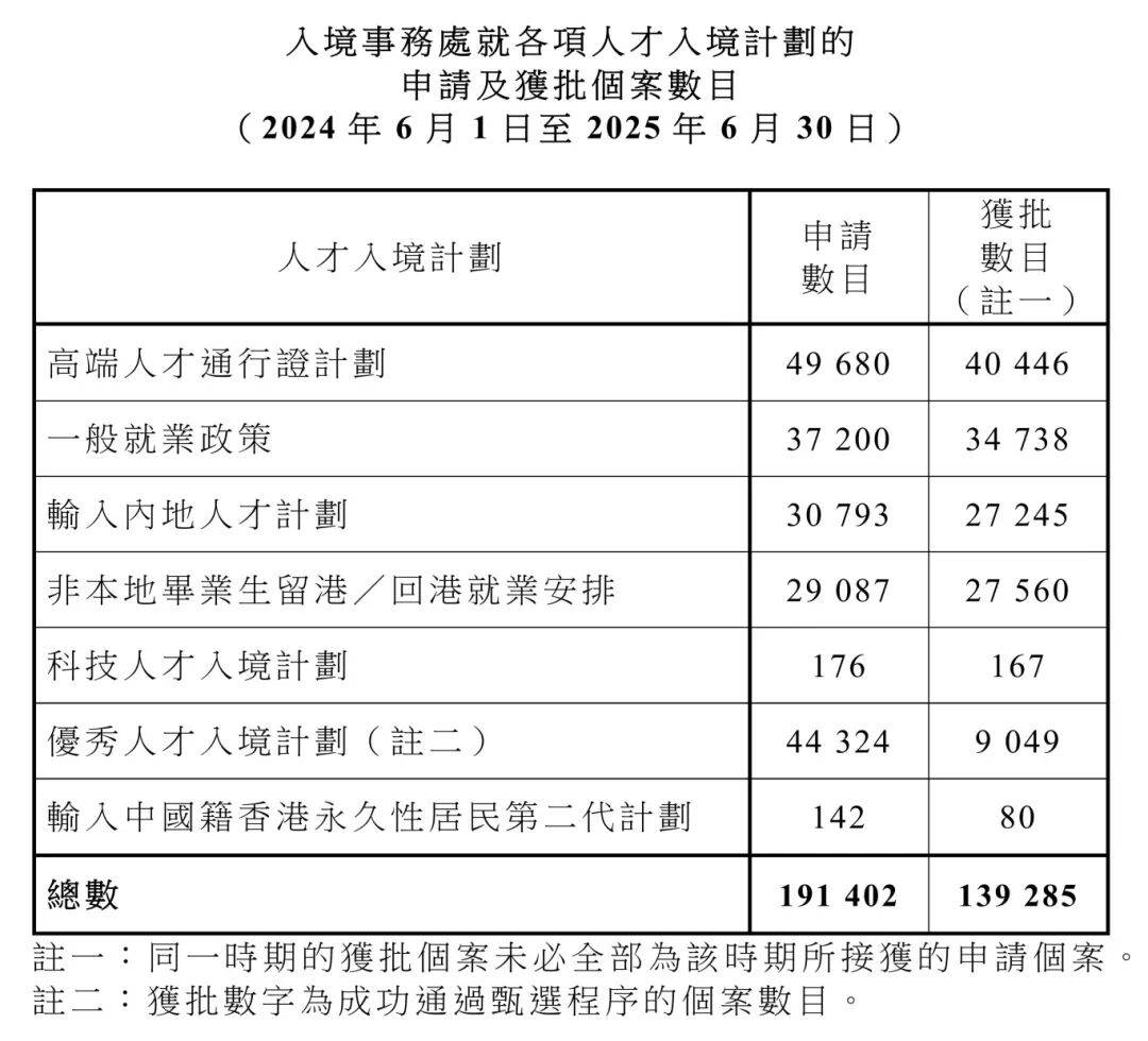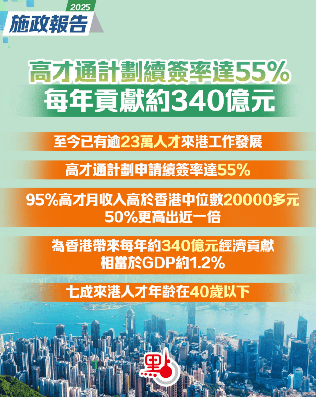 过去几年,各项人才计划已累计吸引约23万人来港工作与发展。其中,“高才通”计划每年为香港带来约340亿港元经济贡献,约占本地生产总值(GDP)的1.2%。引进人才中,约七成年龄在40岁以下,95%月薪高于本地收入中位数,近半数人月薪接近中位数的两倍。