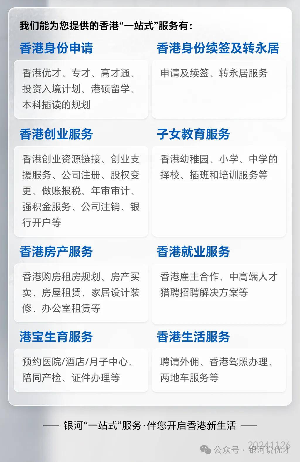 另外,银河集团拥有着全国领先的香港“一站式”服务:银河集团提供全面的服务,涵盖香港身份、教育、创业、就业、房产、港宝等“一站式”服务体系,如果你想让孩子去香港读书,也可以找银河君快速了解(17319271820)