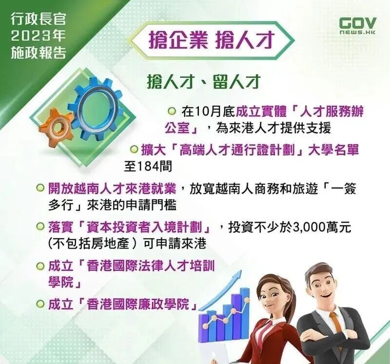 推出“高端人才通行证计划”(高才通):吸引高收入人士(年收入250万港元以上)及全球百强大学毕业生。