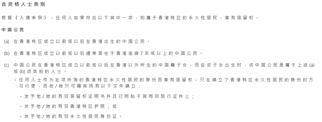 根据香港入境处规定,中国公民申请香港永居身份需符合以下条件之一: