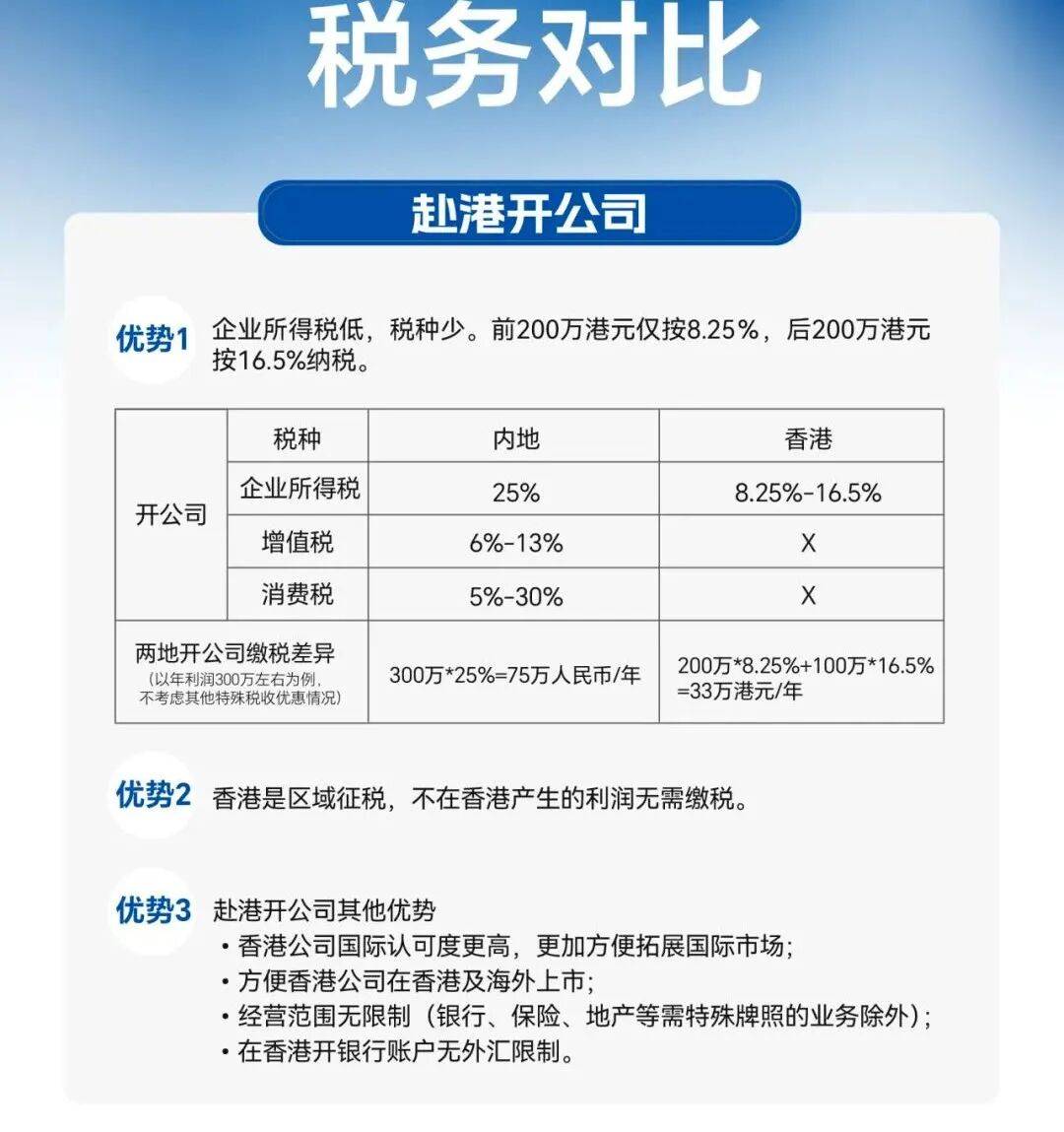低税率:香港实行 “两级税制”,首 200 万港元利润仅按 8.25% 征收利得税,超过部分按 16.5% 征收(对比内地 25% 的企业所得税,税负大幅降低);且无增值税、消费税、资本利得税,对跨境业务更友好。