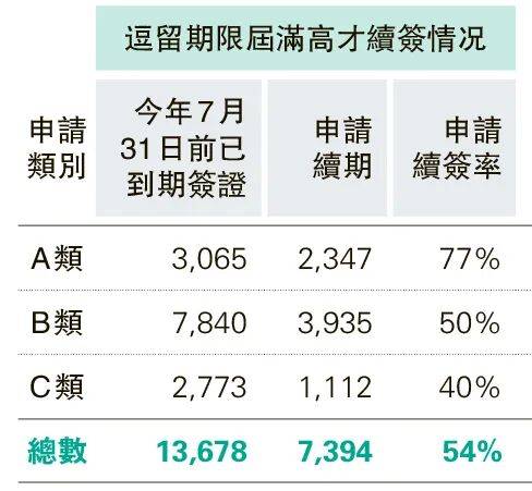 相较于B类和C类高才,A类高才(即年收入达250万港币及以上的高收入群体)的续签申请率领先。