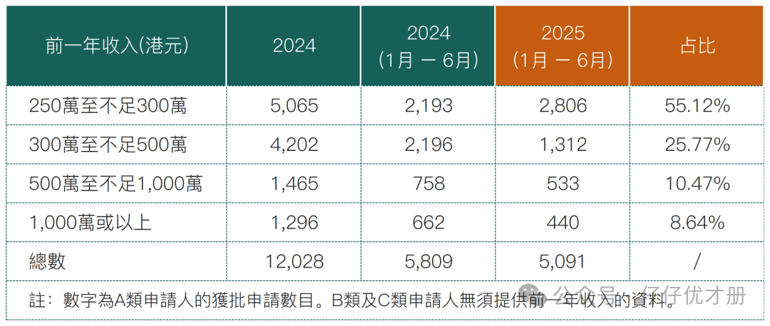 上半年,A类签证共有5,091宗获批。其中,250 - 300万收入群体规模明显增加,占比达到55%;300 - 500万收入群体占比为25.77%。而在去年同期,这两个收入区间的人群占比相近,均约为38%。
