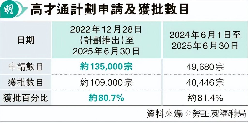 根据港府透露的数据,香港高才通从实施到2025年7月底,香港高才通申请数据近14万宗、获批数据约11万宗。