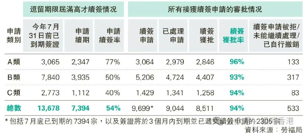 根据港府透露,今年7月签证到期的高才共有13678宗,最终申请续签的人才数量是9699宗,续签率是54%,其中高才A类人才最积极申请续签,续签率高达77%,最后续签通过率也是最高的,有96%。