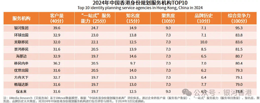 根据《2024年中国香港身份规划服务市场发展研究报告》中的数据显示,一共5项评分项,银河集团就占了四个第一!