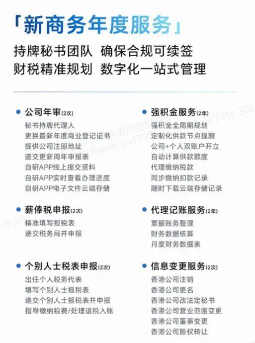 包括公司年审、强积金服务、薪俸税申报、信息变更服务、个别人士税表申报、代理记账服务等。
