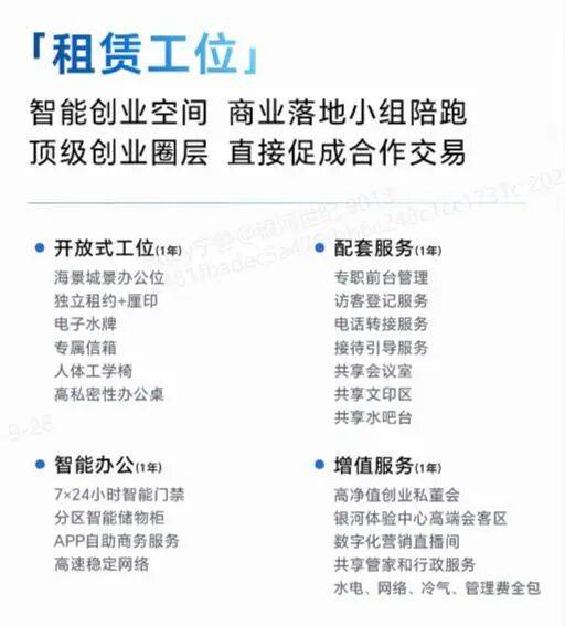 配套服务包括独立工位、智能办公、前台接待、会议室预订等。