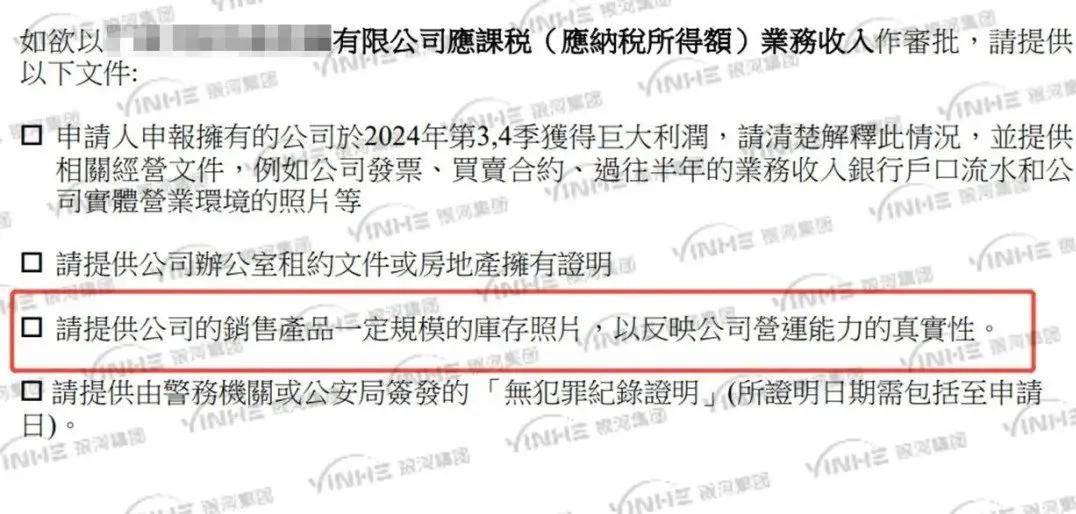 最近银河集团收到的续签申请补件中,入境处明确指出了这一点:“请提供公司的销售产品一定规模的库存照片,以反映公司管理能力的真实性”。