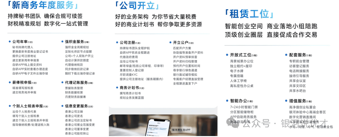 银河集团提供多种创业服务套餐,不管你在香港是否有公司、是否有业务,都能匹配适合您的创业服务!欢迎跟银河君(17319271820)了解服务详情: