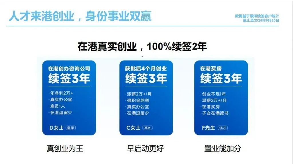 根据我们银河集团针对高才续签群体的统计,高才在港真实业务/工作+良好收入+通常性往来,其续签成功率可以达到100%。其中,长期生活在内地,但是在港真实创业的高才群体,可以100%续签2年。