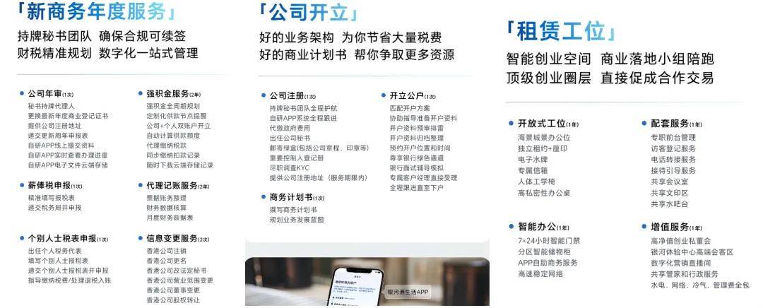 银河集团提供多种一站式香港创业服务套餐,不管你在香港是否有公司、是否有业务、是否有身份,都能匹配适合您的创业服务!欢迎跟银河君(17319271820)了解服务详情: