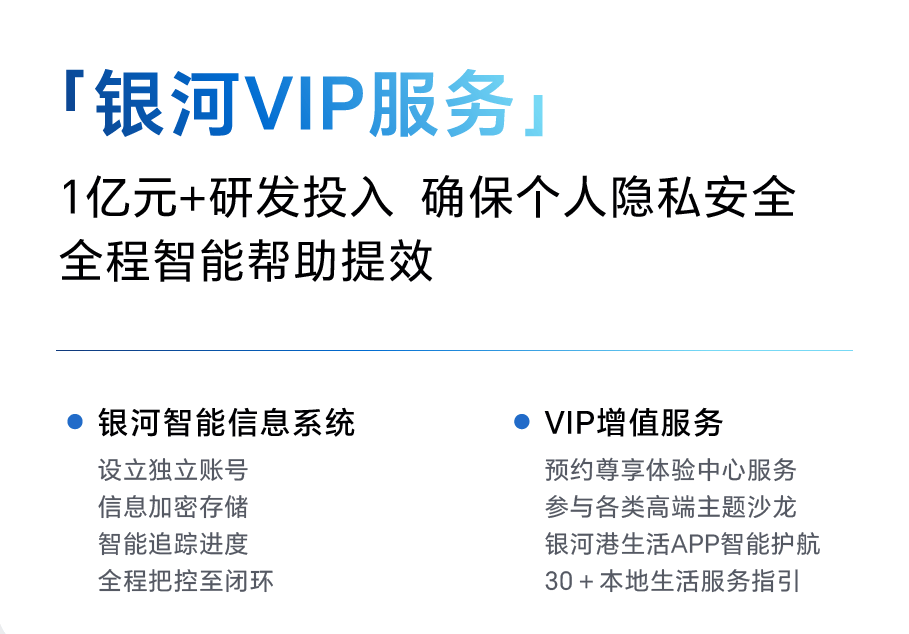 ✔ 银河VIP服务:尊享银河智能信息系统、预约制体验中心、高端主题沙龙及App智能护航,提供30+本地生活与商务指引。