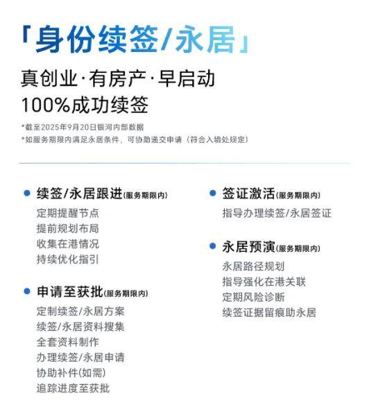 ✔ 续签永居:续签到永居全流程跟进,协助准备续签材料、填写续签申请。银河真经营提供的服务具备“真实地址 + 真实流水 + 真实经营”的特点,严格对标香港永居续签要求,并顺利通过。至今银河仍保持100%续签获批率(数据截至2025年10月)。