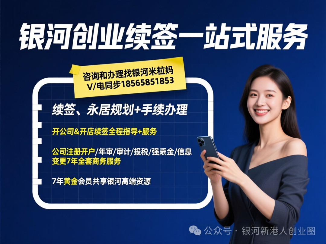 如需香港身份续签或转永居专业支持,可以DD银河米粒妈:18565851853&17675416895,银河创业续期一站式服务为您提供从续签规划、公司注册到永居申请的全流程服务。