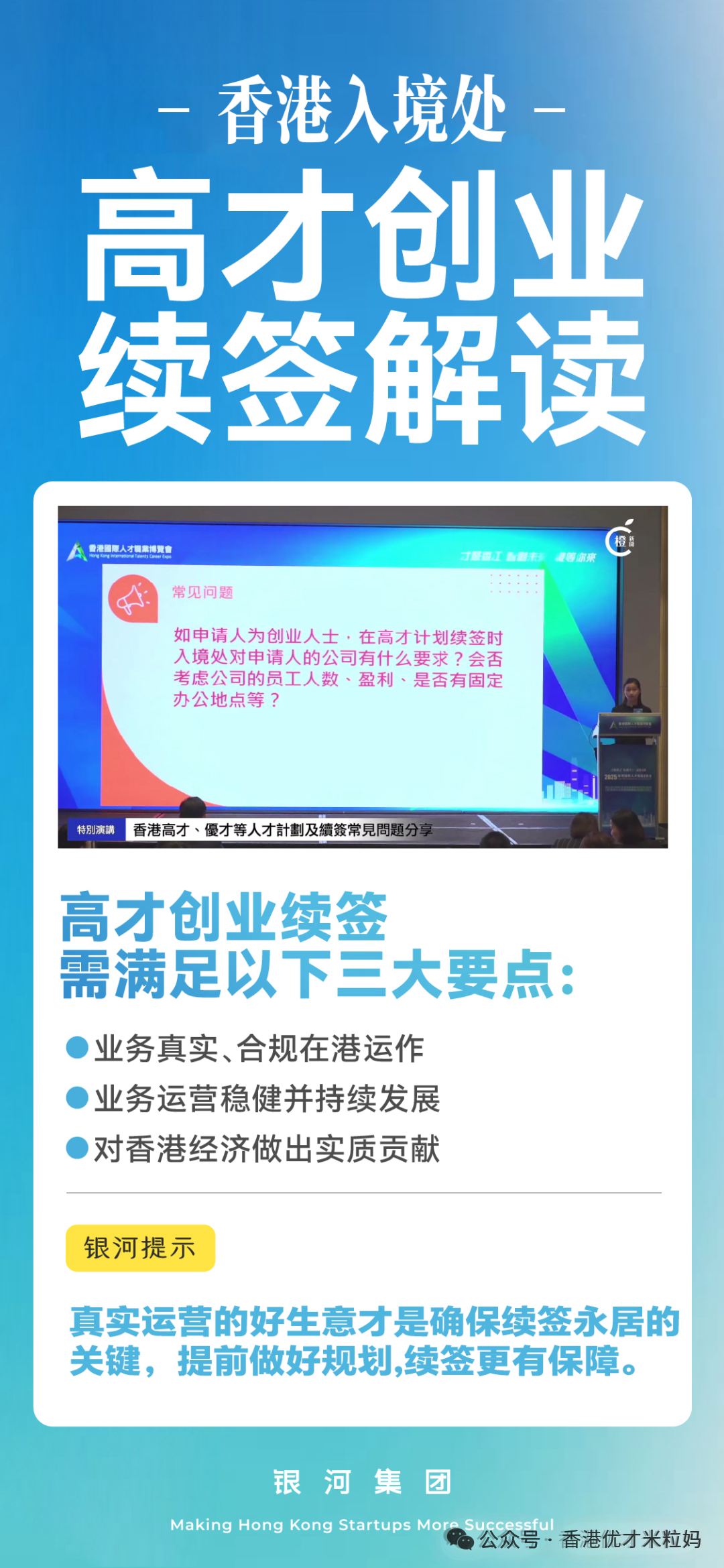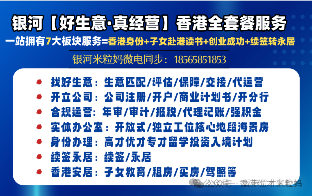 银河集团深耕香港人才服务十几年,熟悉高才通政策细节,能够根据申请人的背景定制专属方案,协助准备全套审核材料,提供从工位、好生意匹配、公司注册、日常运营的配套服务,助您避开政策陷阱,轻松搞定续签与转永居。如果您打算办理高才或者续签,可以DD银河米粒妈18565851853&17675416895 获取一对一的定制方案,及时把握香港身份带来的红利。
