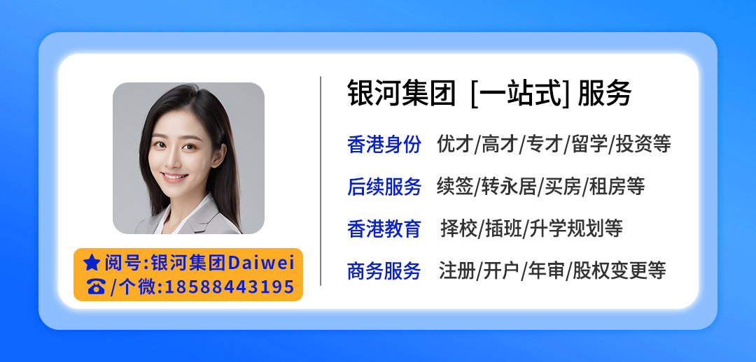 银河集团业务涵盖:香港身份申请、续签转永居,香港创业、就业咨询、房产、港宝教育等全方位、一站式的服务体系,确保申请人从申请到赴港后的身份续签永居及生活/创业得到妥善安排与保障。有需求请直接滴滴银河集团的Daiwei,享受专属的1v1咨询服务:电话/个微同V:18588443195;18588447901