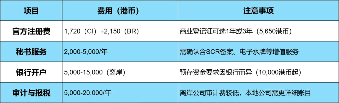 公司注册处费用:港府对公司注册证书的首次收费为 1,720 港币,商业登记证每年收费 2,150 港币。