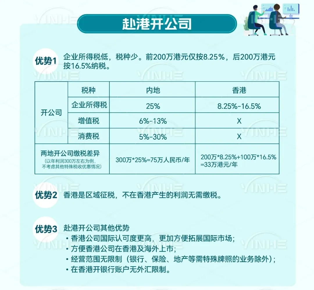 香港对中小企业有税务扶持,按2023年税率,利润7万港币以下免税,200 万港币以下部分按 8.25% 征税,超过200万港币部分按16.5% 征税,相较于内地近45% 的企业所得税,香港的税率对企业而言是极大的利好。