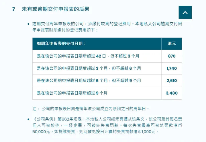 逾期罚款:如果未按时提交相关文件,将产生逾期罚款,且罚款金额随延迟时间增加,最高可达 3,480 港币。