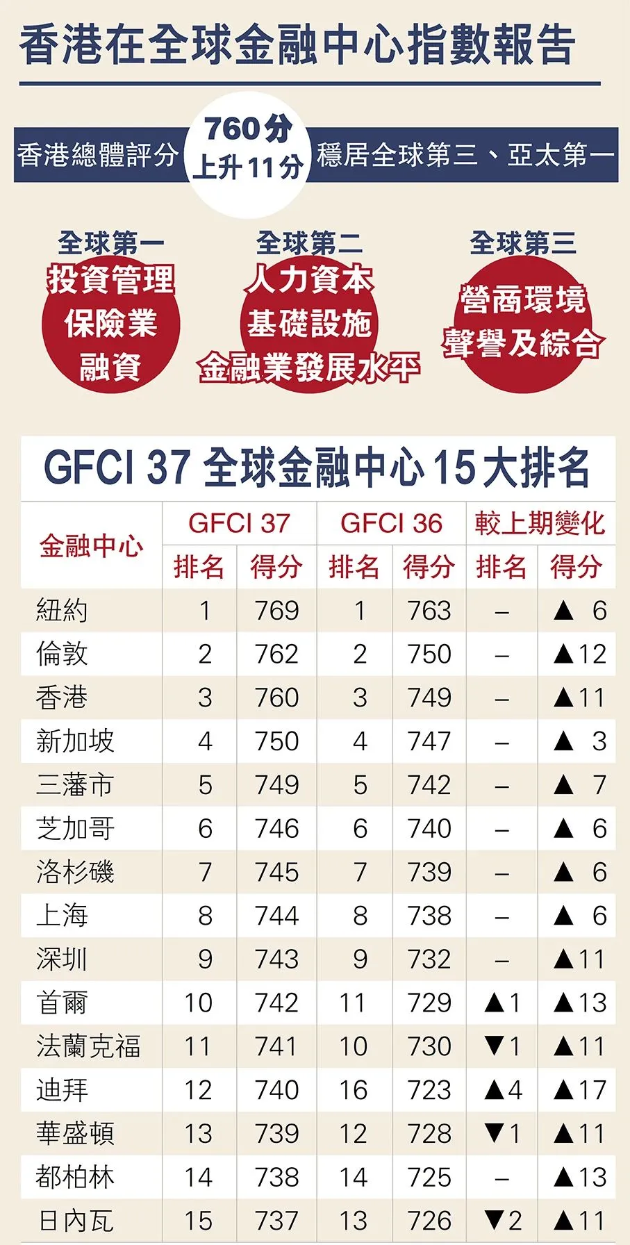2025年《全球金融中心指数》(由Z/Yen集团与深高金联合发布,评估119个金融中心)显示,香港在营商环境、人力资本、基础设施、金融业发展及声誉等维度均居全球前三(人力资本、基础设施、金融业发展列第二,综合及营商环境声誉列第三)。