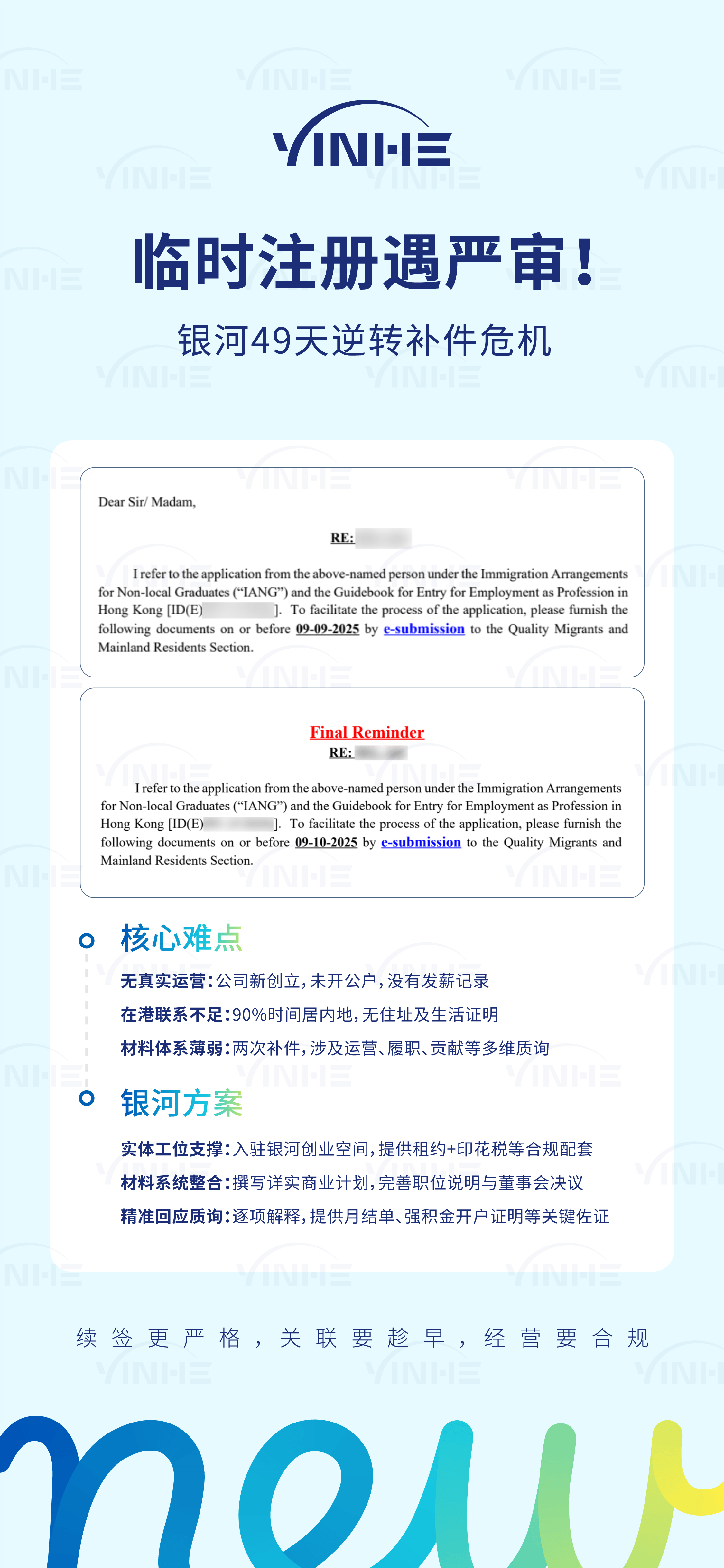 风险点:部分申请人临近签证到期才匆忙找工作或注册公司,被入境处认定为“临时性应付”,可能仅获批短期签证。