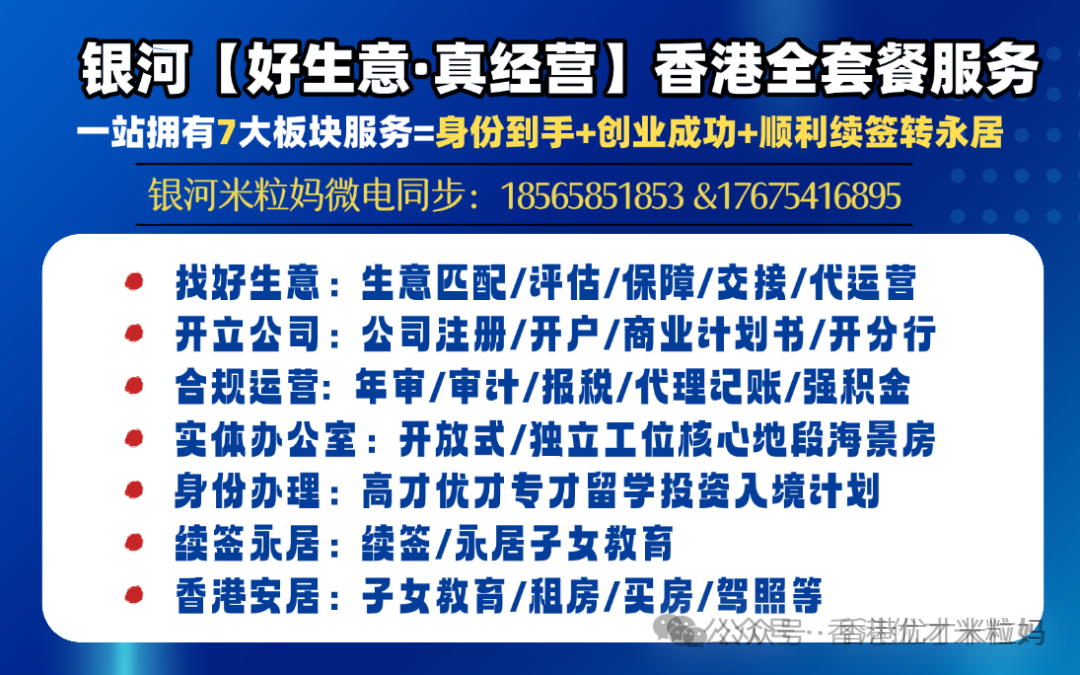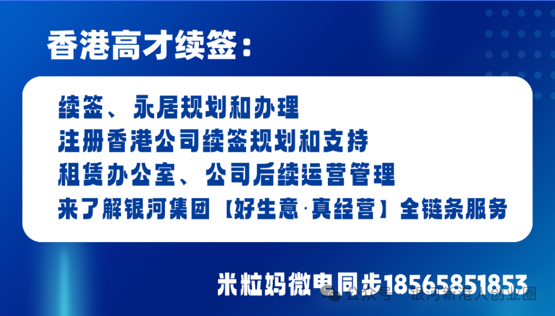 银河集团深耕香港人才服务十几年,熟悉高才通政策细节,能够根据申请人的背景定制专属方案,协助准备全套审核材料,提供从工位、好生意匹配、公司注册、日常运营的配套服务,助您避开政策陷阱,轻松搞定续签与转永居。如果您打算办理高才或者续签,可以DD银河米粒妈18565851853&17675416895 获取一对一的定制方案,及时把握香港身份带来的红利。