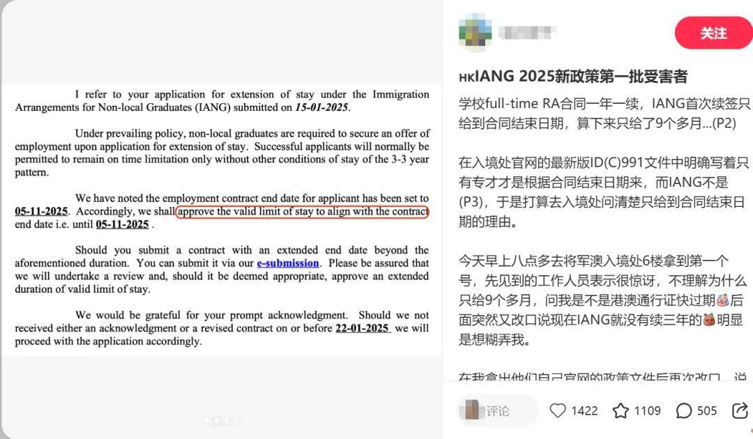 近期,一位博主在社交平台分享了自己曲折的 IANG 签证续签经历,引发广泛关注。该博主就职于香港某院校,持有的是每年续签一次的(full - time RA)合同。首次申请 IANG 签证续签时,获批期限竟仅到合同结束日,算下来只有短短 9 个多月。