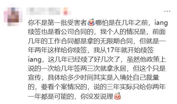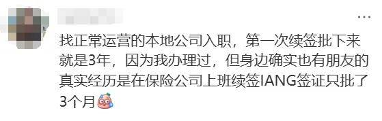而还有网友说:“因为办理过,在正常的运营本地公司入职,是正常3年,但身份有朋友在保险公司上班续签iang签证只批了3个月”。