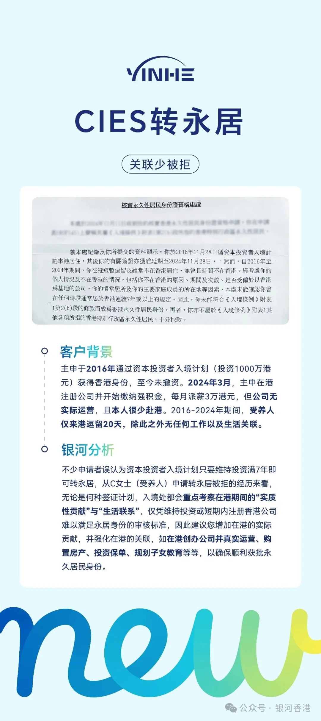 银河集团从C女士(受养人)电请转永居被拒的经历来看,无论是何种签证计划,入境处都会重点考察在港期间的“实质性贡献”与“生活联系”,仅凭维持投资或短期内注册香港公司难以满足永居身份的审核标准,因此建议她增加在港的实际贡献,并强化在港的关联,如在港创办公司并真实运营、购置房产、投资保单、规划子女教育等等,以确保顺利获批永久居民身份。