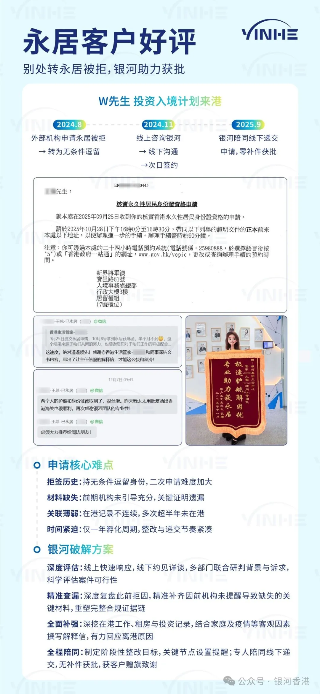 无独有偶,另一位通过香港投资入境计划申请的W先生也在转永居时遇到问题,曾经在外部机构协助下递交申请过一次转永居被拒,只能转为无条件逗留,今年考虑启动二次转永居申请找到银河集团。