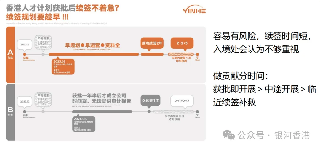 香港身份续签越早规划越好,很多人以为等到最后1年或续签前几个月再准备也来得及,实际上并非如此,如果获批一年半才开始成立公司,很容易只拿到半年或1年的短期续签,后期还要继续准备材料申请,也容易被拒。