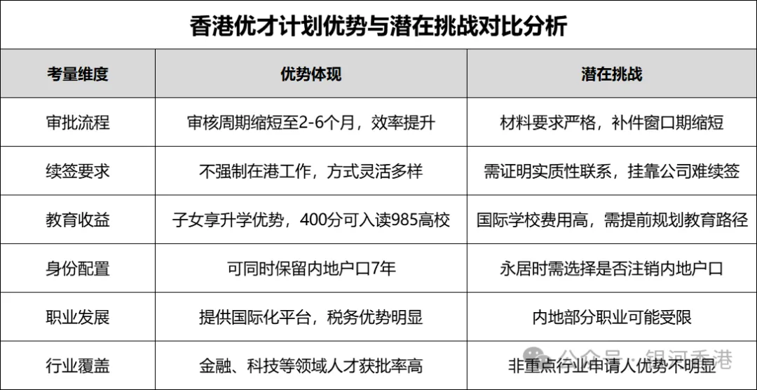 香港优才计划作为获取香港身份的重要途径,既有显著优势,也存在一些潜在挑战。申请人在决策前应当全面权衡利弊,确保这一选择符合个人及家庭的长远规划。以下从多个维度分析香港优才计划的优势与潜在考量: