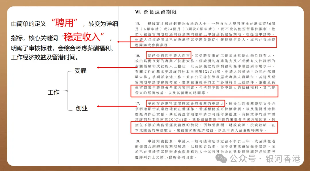 香港优才续签要求上,新增了“稳定收入”四个字,要求申请人通过就业、创业或家庭纽带等方式,证明对香港经济的直接价值,而非仅依赖形式上的居住联系。