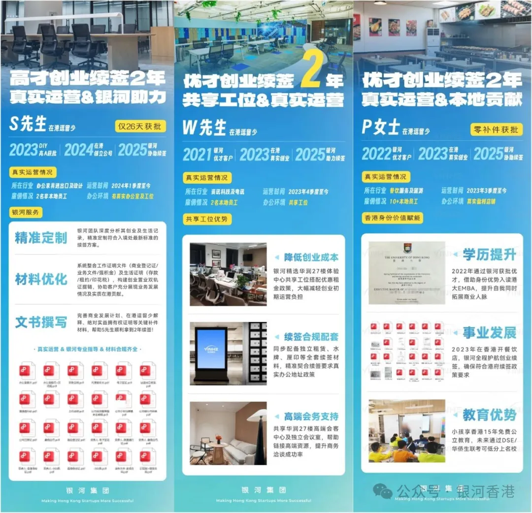 银河【好生意x真经营】系列更是结合客户身份+创业双需求,提供一站式身份+续签+创业服务,如果你有打算续签香港身份和赴港创业,可以协助你全方位布局香港创业续签,满足注册公司+真实业务+办公场地+实质贡献的续签要求。有兴趣记得找我咨询和办理【微信同号:18148597167或18851】