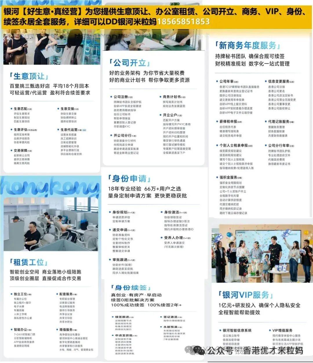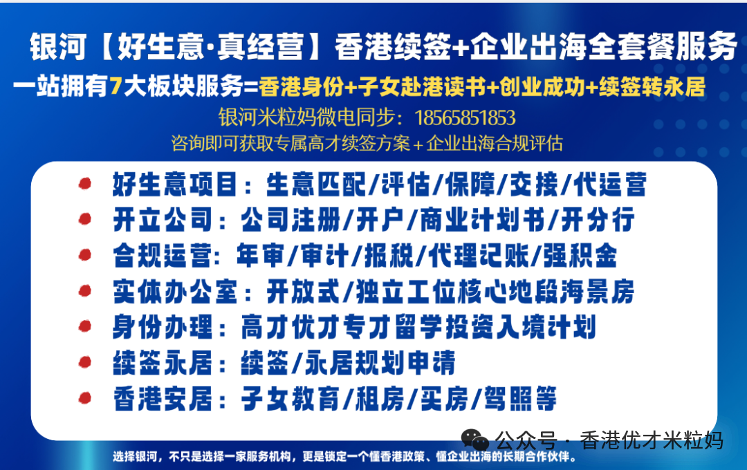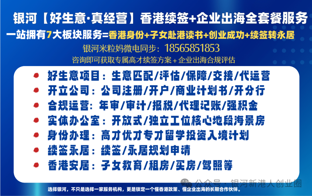 银河【好生意·真经营】提供香港身份续签、转永居、注册香港公司、开户、商业计划书、公司财税合规运营(年审/审计/报税/代理记账/强积金等)、税务规划、实体办公室、子女教育全链条服务,如需咨询欢迎随时DD银河米粒妈(18565851853)