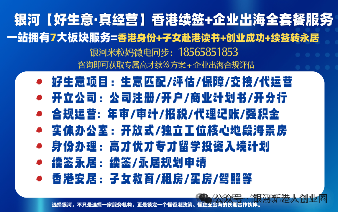 银河【好生意·真经营】提供香港身份续签、转永居、注册香港公司、开户、商业计划书、公司财税合规运营(年审审计报税等)、强积金、信息变更、税务规划、租赁实体办公室、子女教育全链条服务,如需咨询欢迎随时DD银河米粒妈(18565851853 &17675416895)