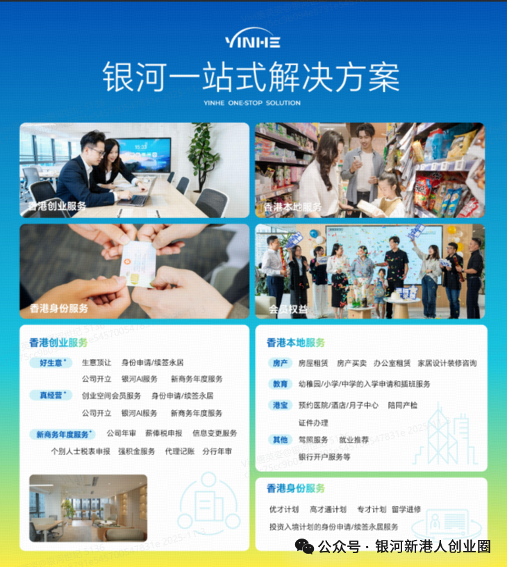 银河【好生意·真经营】提供香港身份续签、转永居、注册香港公司、开户、商业计划书、公司财税合规运营(年审审计报税等)、强积金、信息变更、税务规划、租赁实体办公室、子女教育全链条服务