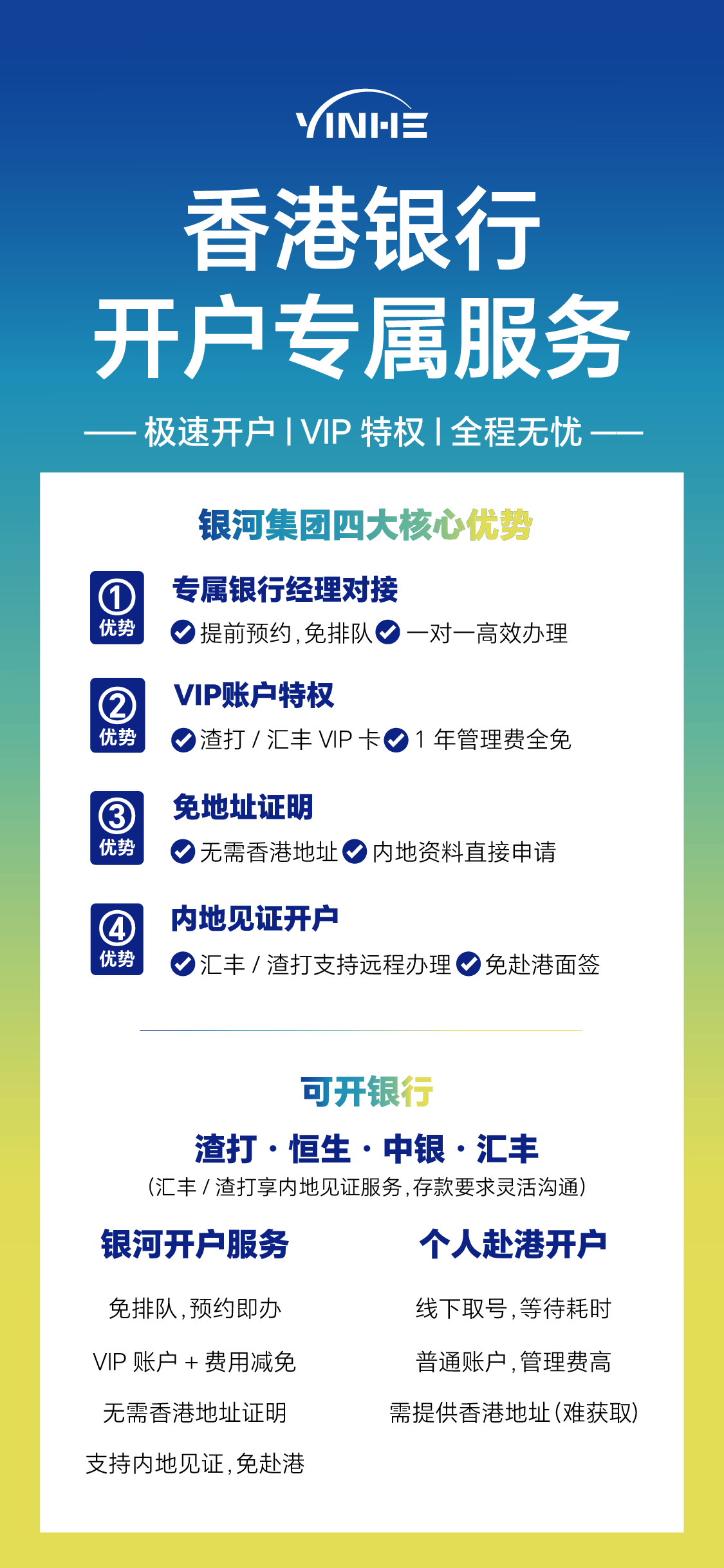 银行选择:香港本地银行(如汇丰、渣打)或国际银行香港分行;