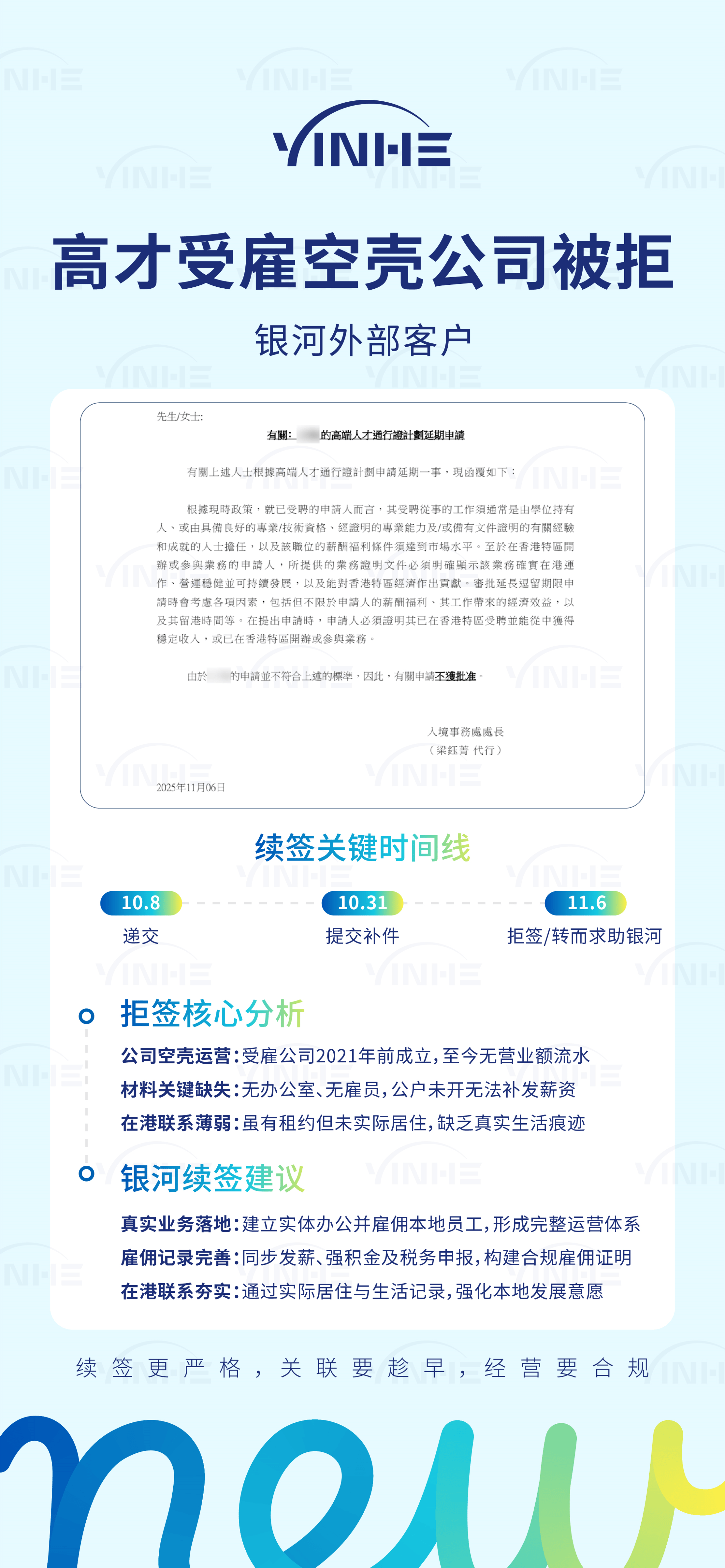 案例情况:银河外部高才用户,通过高才B拿到香港身份,2023年10月激活身份后未再入境香港。在香港注册了一家贸易公司,有开户但无雇员、无发薪、无真实经营,仅有一些股票投资。因与香港关联极少,续签时被拒。