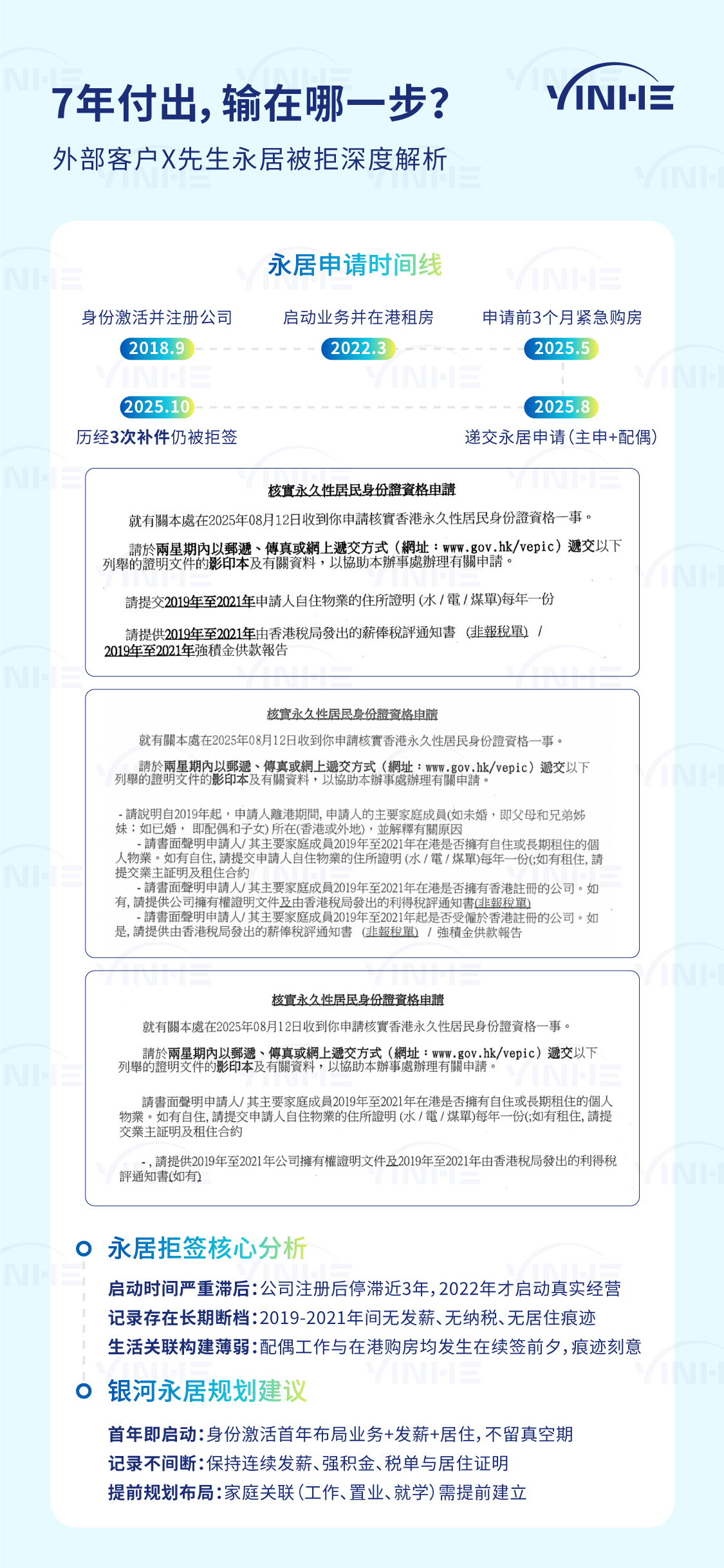 案例情况:外部客户X先生在申请永居时,因材料缺失导致多次补件仍被拒签。X先生2018年9月身份激活并注册公司,2022年3月启动业务并在港租房,2025年5月申请前3个月紧急购房,但2019—2021年间无发薪、无纳税、无居住痕迹,配偶工作与在港购房均发生在续签前夕,痕迹刻意,生活关联构建薄弱。