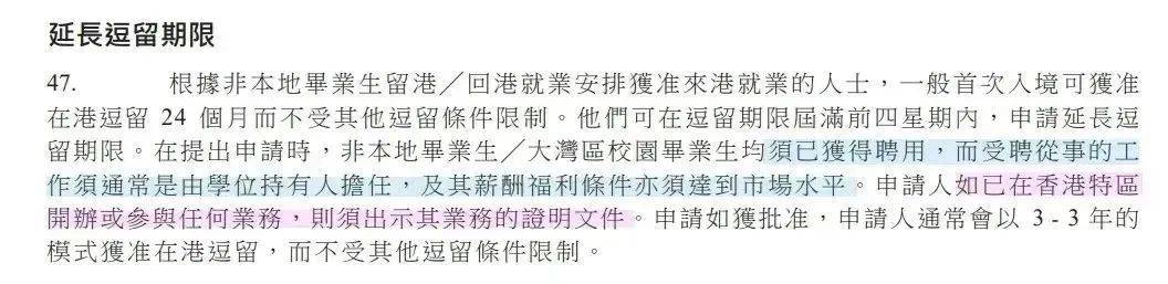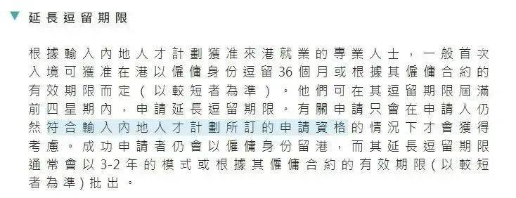 长期且需有稳定收入:如属于被香港本地公司雇佣人士,除需要满足旧标准外,新增续签要求为「从中获得稳定收入」,即申请人需要时香港本地公司或企业正式、长期的员工,需向入境处提交雇佣合同,列明工资、薪酬、休假制度等,不能是兼职的,不建议在临近续签时入职保险公司,否则可能会导致入境处质疑入职动机,降低续签通过的可能性。