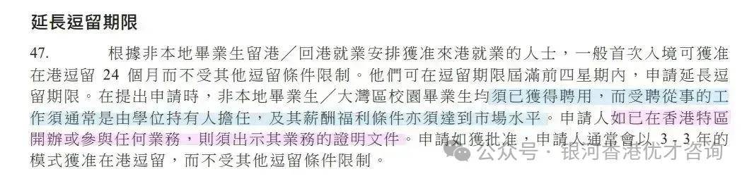 ①非本地毕业生/大湾区校园毕业生均须已获得聘用,而受聘从事的工作须通常是由学位持有人担任,及其薪酬福利条件亦须达到市场水平。