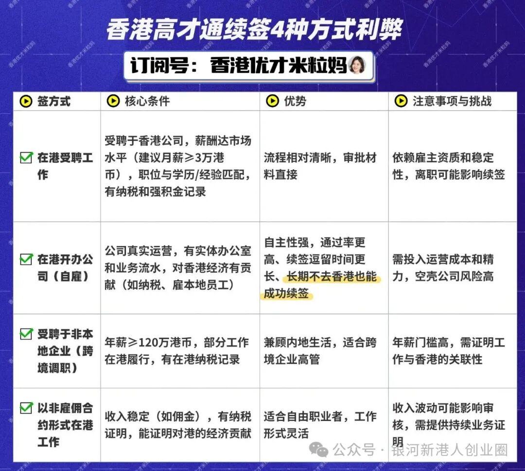 高才获批后就需要做好续签规划,选择合适的续签方式,及时建立与香港工作和生活关联。如果你想要保留内地工作和生活重心,暂时无赴港计划,那么可以选择创业自雇续签。创业自雇续签最灵活、自主性更强、通过率也更高。