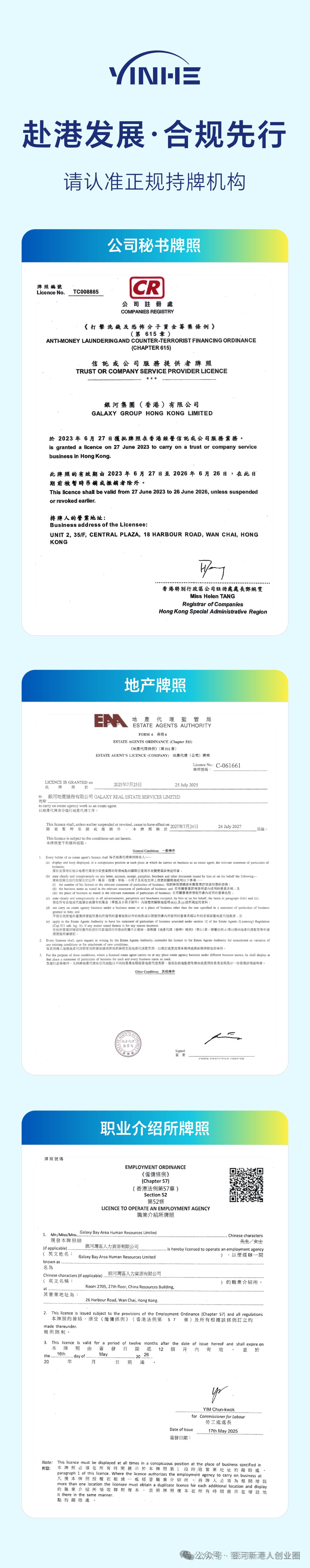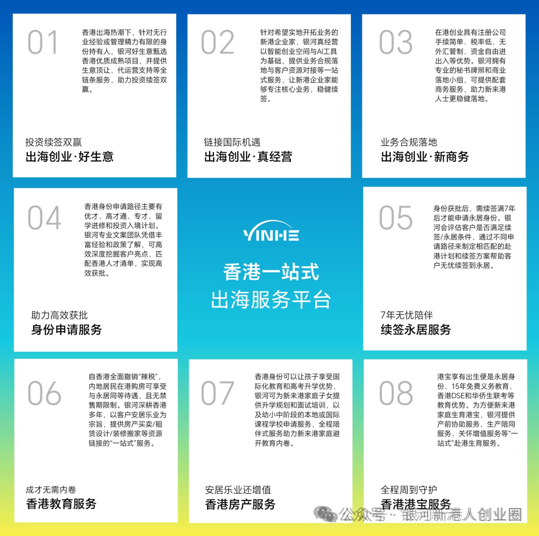 银河【好生意·真经营】提供香港身份续签、转永居、注册香港公司、开户、商业计划书、公司财税合规运营(年审/审计/报税等)、税务规划、租赁实体办公室、子女教育全链条服务。银河集团高才续签咨询热线:18565851853 &17675416895