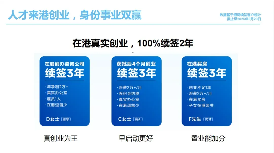 目前,根据银河创业续签客户统计,真实在港创业续签率100%,且最低续签期限为2年(截止2025年9月20日统计数据):