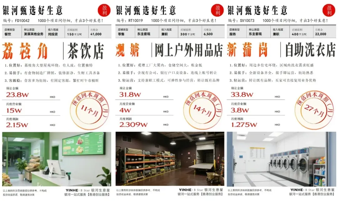 目前银河好生意在库项目超过2000+,覆盖全港各行各业,全都是真实店铺,从现有东主手中收购,帮助大家无缝对接香港创业,利用香港营商环境优势,一键开启无痛创业。