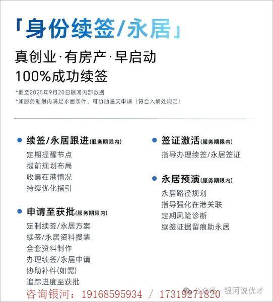 银河集团深耕香港身份服务十余年,有着100%成功续签纪录(数据截至2025年10月)、行业第一的综合实力,提供从续签规划、政策解读、材料梳理、文书撰写、合规运营、永居整合的一站式闭环服务,助你牢牢掌控身份主动权,稳妥衔接续签与永居。联系银河免费了解详情(电/微:17319271820 / 19168595934)