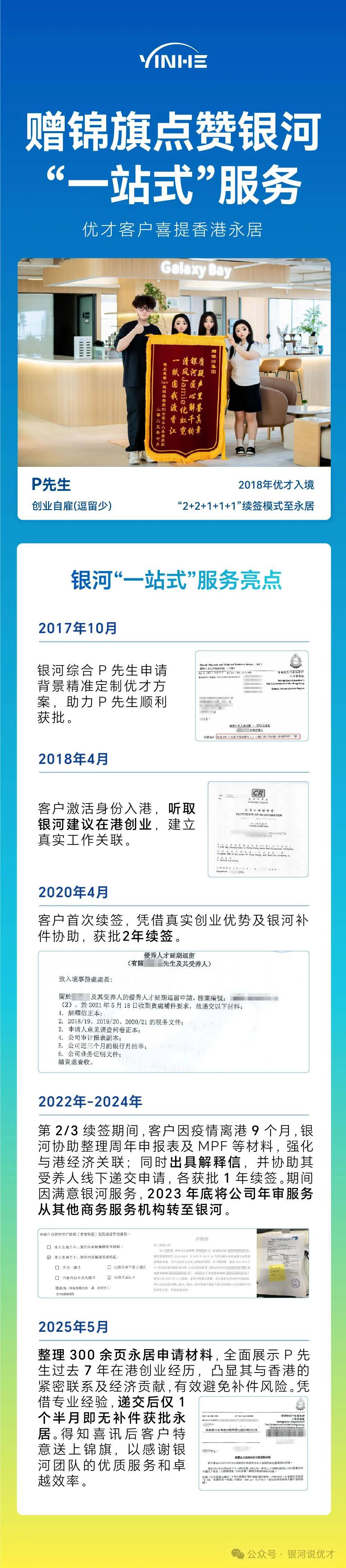 银河凭借十余年香港身份服务经验,提供“从申请到永居”的全流程陪跑,解决政策理解不清、材料散乱、突发状况应对难等核心痛点。